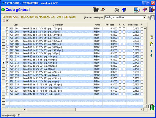 Un catalogue comprenant plus de 7500 éléments est inclut à l'achat du logiciel. Il est possible d'obtenir les mises à jours des prix de matériaux et de la main- d'ouvre en vous abonnant sur le site www.LeCatalogue.ca.