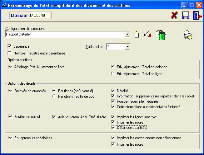 Relevé de quantités, détaillé (incluant aussi le résumé)